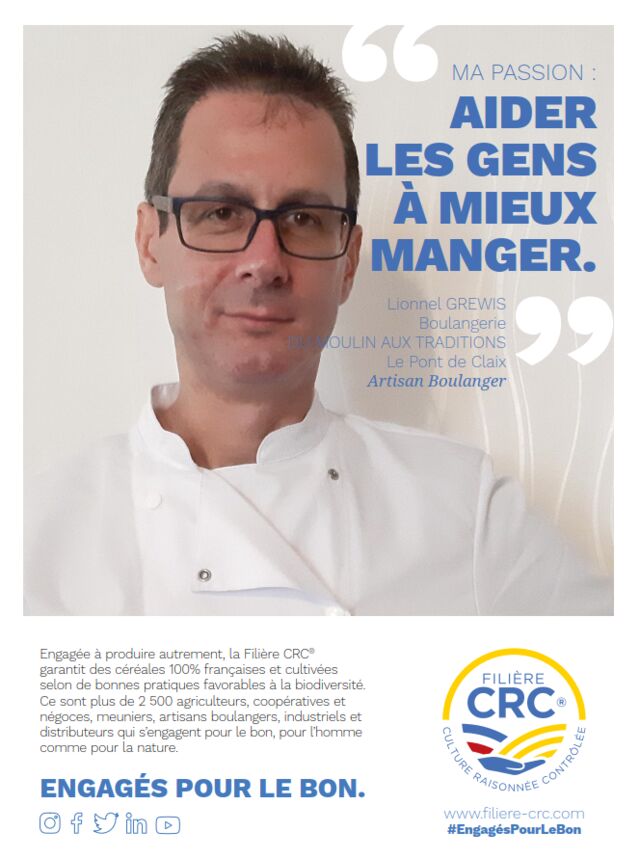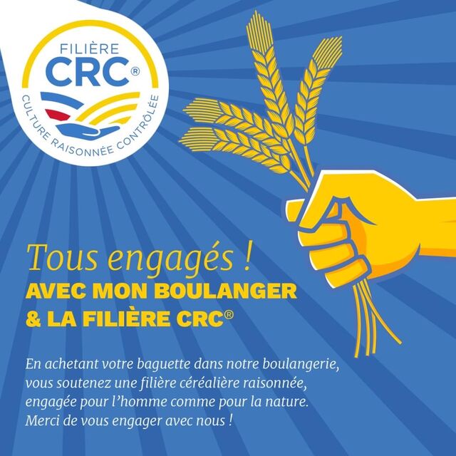Nous somme engagés filière CRC : Culture Raisonnée Contrôlée, en achetant votre baguette dans notre boulangerie, vous soutenez une filière céréalière raisonnée, engagée pour l'homme comme pour la nature.